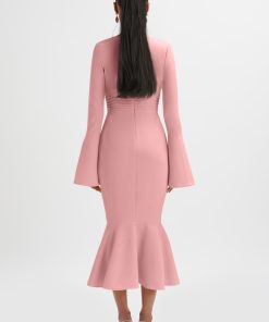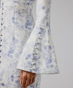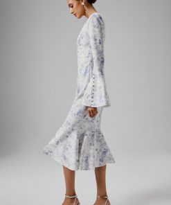 Lavish Alice Women’s Salma Fluted Sleeve Longline Fishtail Midi Dress In Blue Porcelain Print