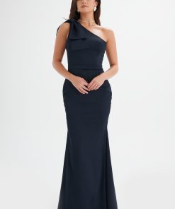 Indulge in luxury with the ALESSANDRA Satin Bow Shoulder Maxi Dress. Crafted from smooth satin, this elegant dress drapes beautifully in midnight blue, accentuating all figures with its fit and flare silhouette. The unique one shoulder sleeve is adorned with a statement bow, making it perfect for formal occasions or as a stunning bridesmaid dress.