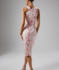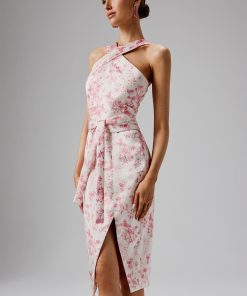 Embrace elegance with our BRIELLE Bonded Satin Obi Belted Halterneck Midi Dress in Pink Porcelain. Crafted from premium bonded satin, this classic midi-length dress features a flattering cross-neck halter neckline and a close-to-body fit that beautifully contours your silhouette. The elegant obi belt cinches the waist, enhancing your shape, while a subtle thigh split adds a hint of allure. This romantic design perfectly balances chic sophistication, making it ideal for spring weddings and formal occasions.