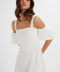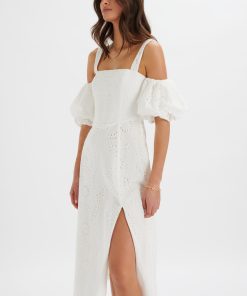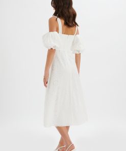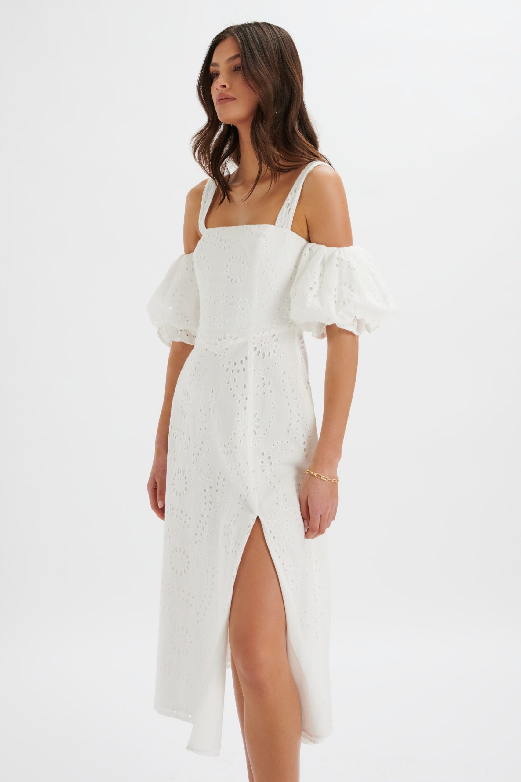 Expertly crafted from premium broderie fabric in a crisp white hue, the CHARLI Off Shoulder Dress exudes a sense of effortless elegance. The balloon puff sleeves and bardot neckline add a touch of femininity, while the midi skirt with a side split flatters any figure. Perfect for spring and garden parties.