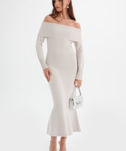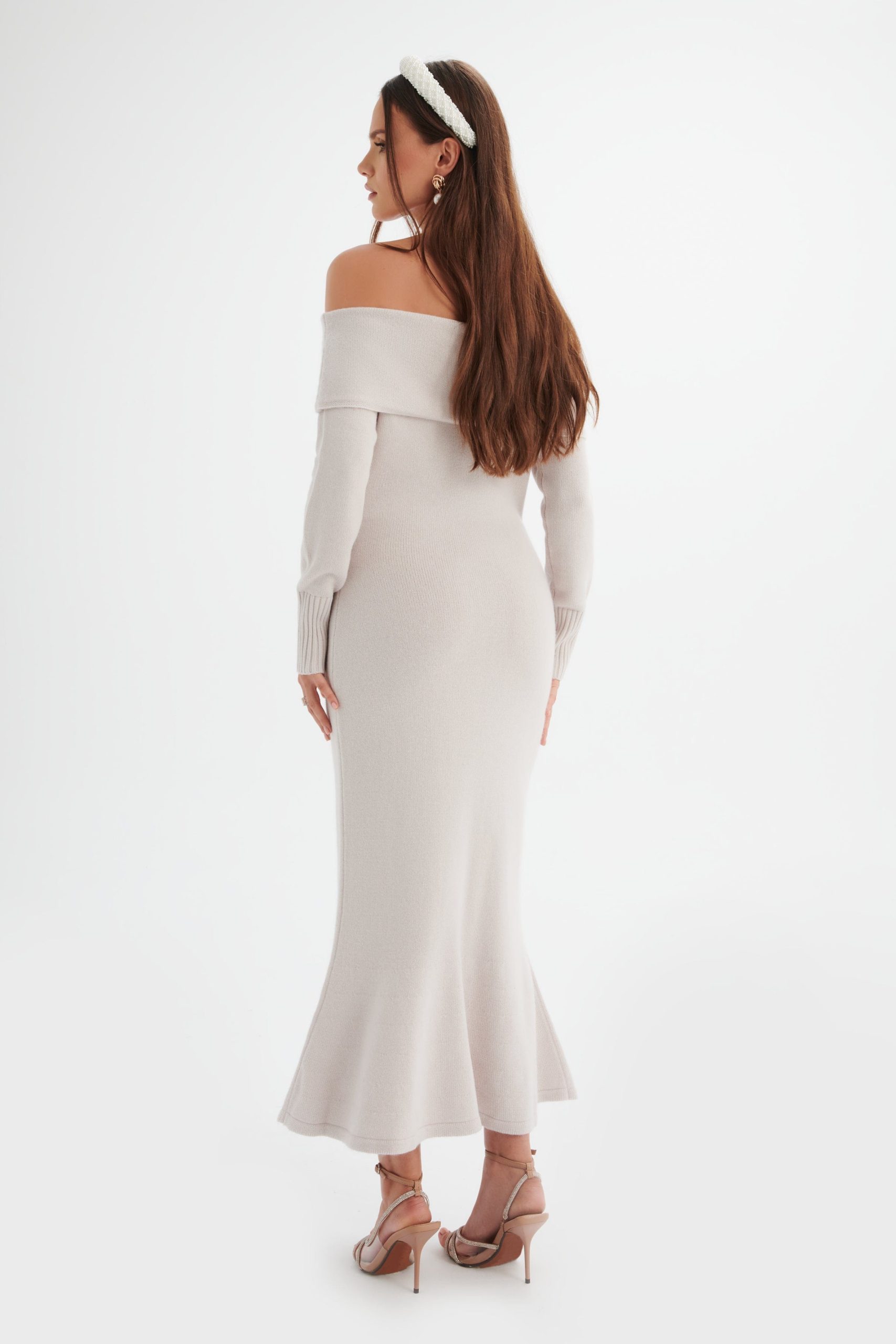 Skilfully crafted with a blend of wool, enhanced with cashmere, our CLOVER dress offers a plush and lavish feel. The folded Bardot neckline and snug sleeves, with textured ribbed cuffs, enhance the off-shoulder design, while the fit-and-flare fishtail hem delivers a touch of refinement. Ideal for any event, this midi dress radiates grace and ease.