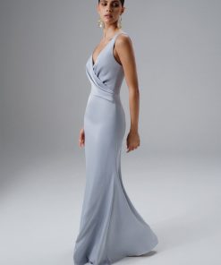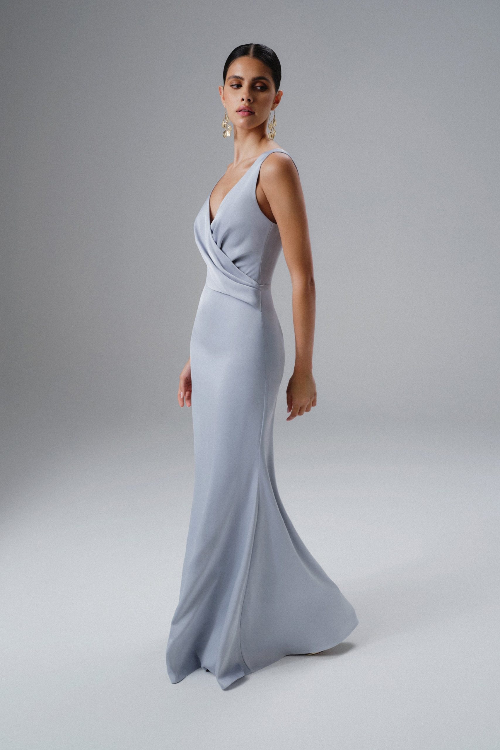 The ultimate bridesmaid dress- ELLE arrives in a dreamy light blue hue, cut from our premium draped satin for a lustrous, fluid finish. Designed with a flattering wrap silhouette, it cinches elegantly at the waist before flowing into a floor-grazing maxi skirt that moves with timeless grace.Perfect for bridesmaids, galas, or any elevated occasion, this dress combines softness and structure for a sleek, sophisticated look that leaves a lasting impression. Pair with minimalist jewellery and soft waves for understated elegance.