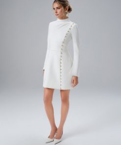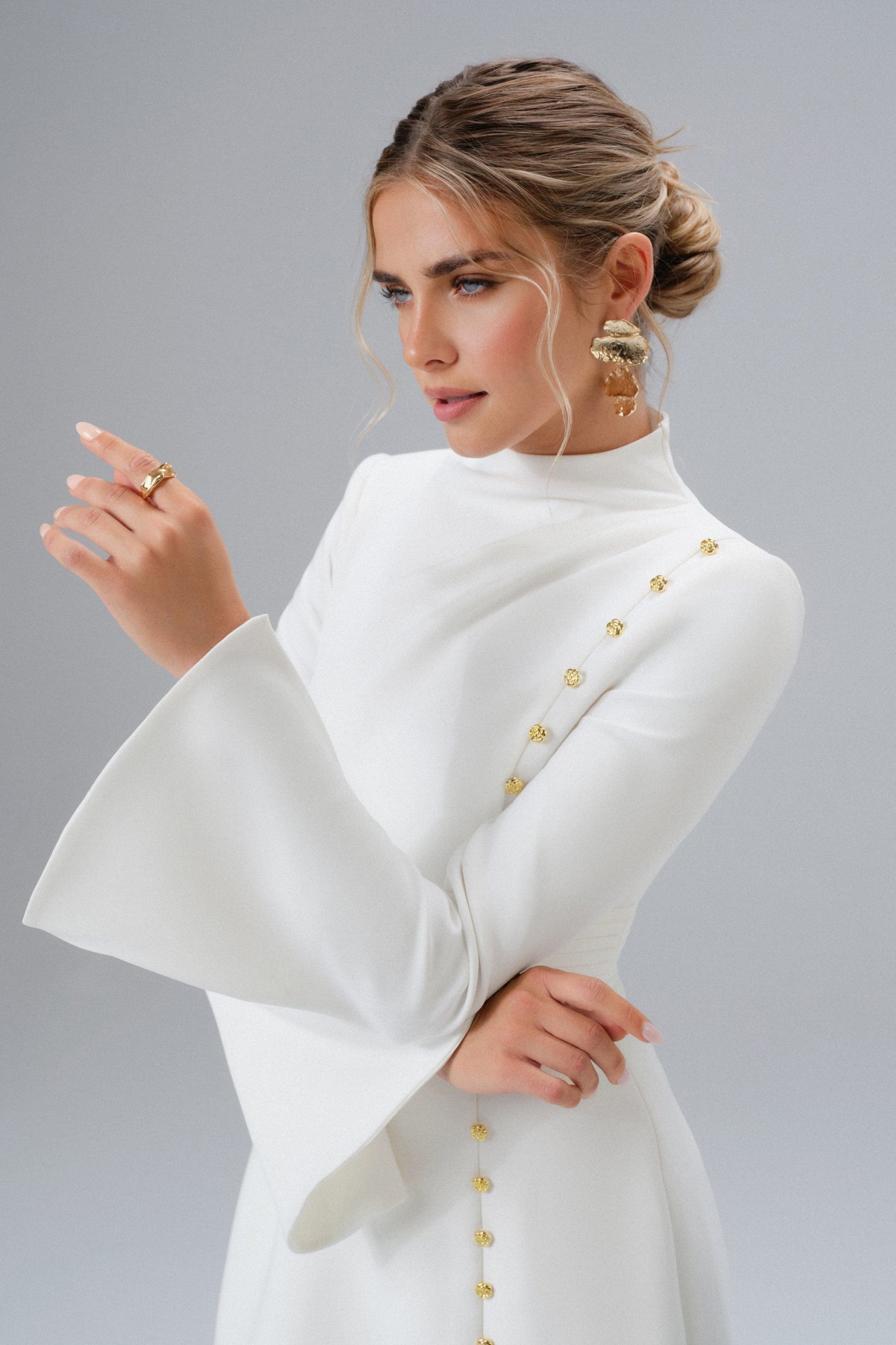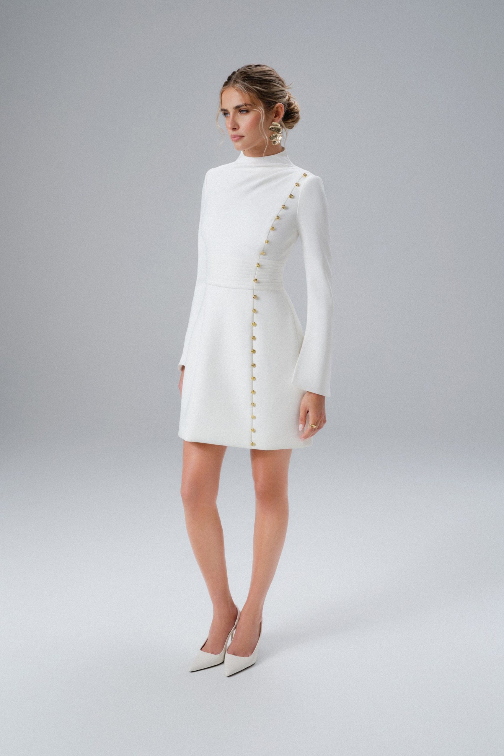 Sleek, sophisticated, and effortlessly chic—the GEMMA mini dress is reimagined in crisp white for a timeless, elevated look. Crafted for a close-to-body fit, it features a high neckline with soft pleat detailing, a pleated waistband to define the waist, and a structured A-line mini skirt. Long flared sleeves add movement, while gold rose buttons trace the centre front. Perfect for bridal celebrations, elegant events, and modern daytime occasions.