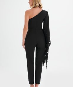 Experience unmatched elegance with the KADY Ombre Embellished One-Shoulder Jumpsuit in Black. Crafted from luxurious crepe, this jumpsuit features a striking asymmetric neckline and a dramatic long cape sleeve adorned with exquisite diamante and pearl embellishments in a captivating ombre pattern. The tapered trousers provide a sleek, body-skimming silhouette, while the flowing cape sleeve adds a touch of playful sophistication. Ideal for elegant dinners, cocktail parties, and any formal affair, this jumpsuit ensures you make a stunning impression.
