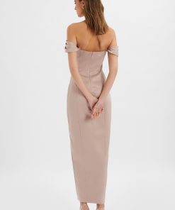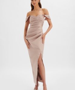 Introducing the epitome of elegance: our KAITLIN Bonded Satin Off Shoulder Maxi Dress In Mink. Crafted from premium bonded satin in a luxurious mink hue, this dress exudes sophistication and grace. The pleated off-shoulder style, paired with a sweetheart neckline, creates a timeless and romantic silhouette. With its maxi length and flattering pleating, this dress skims the body gracefully, offering a close-to-body fit for an enhanced silhouette. Perfect for bridesmaids, its classic and timeless design ensures it’s a versatile choice for any bridal party.
