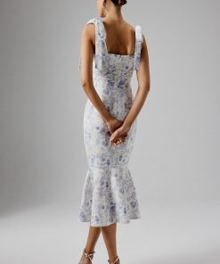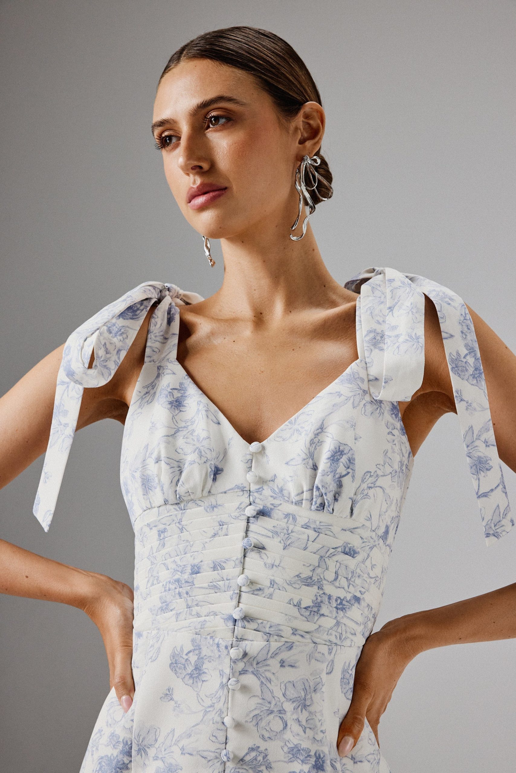An icon, our KAMILA dress, is beautifully reimagined in a striking blue porcelain print.This luxurious crepe fabric drapes effortlessly, hugging your figure and flowing into a fit-and-flare hemline that creates an elegant silhouette. With functional self-fabric tie straps and a flattering pleated waistband, the dress embodies femininity and charm. Its longline midi length exudes timeless sophistication, while the delicate micro button detailing along the centre front adds a refined touch. Perfect for wedding guest attire, Ladies’ Day, or any other special occasion.