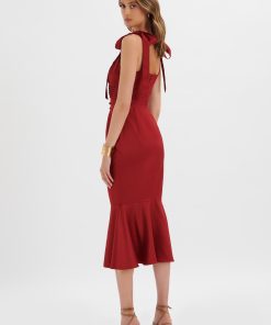 Introducing the KAMILA Tie Strap Micro Button Satin Midi Dress in Burgundy, a vision of autumnal elegance. Crafted from premium satin, this midi dress features statement bows on each shoulder in seasonal burgundy, complemented by delicate micro button detailing down the centre. With a pleated waistband to flatter your figure, it’s the epitome of chic and romantic sophistication for any elegant affair. Wear your hair in a soft up-do and let KAMILA do the talking.