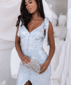 Lavish Alice Women’s Kamila Tie Strap Micro Button Sequin Midi Dress In Silver