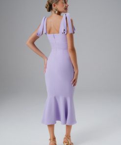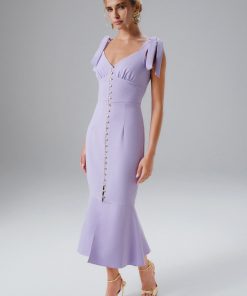 A timeless icon, the KAMILA dress returns in soft lilac—radiating effortless sophistication and feminine allure. Crafted from luxurious crepe, it sculpts the figure before falling into a graceful fit-and-flare hem that moves beautifully with every step. Gold shell buttons trail the centre front for a touch of refined opulence, while self-tie straps offer a romantic, customisable fit. With its elegant longline midi length, KAMILA is perfect for weddings, garden parties, Ladies Day, and destination events.
