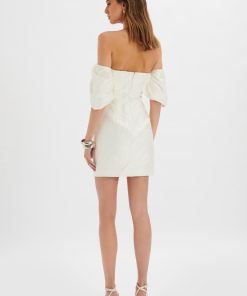 Lavish Alice Women’s Katelynn Bardot Mini Dress With Puff Sleeve In White Jacquard