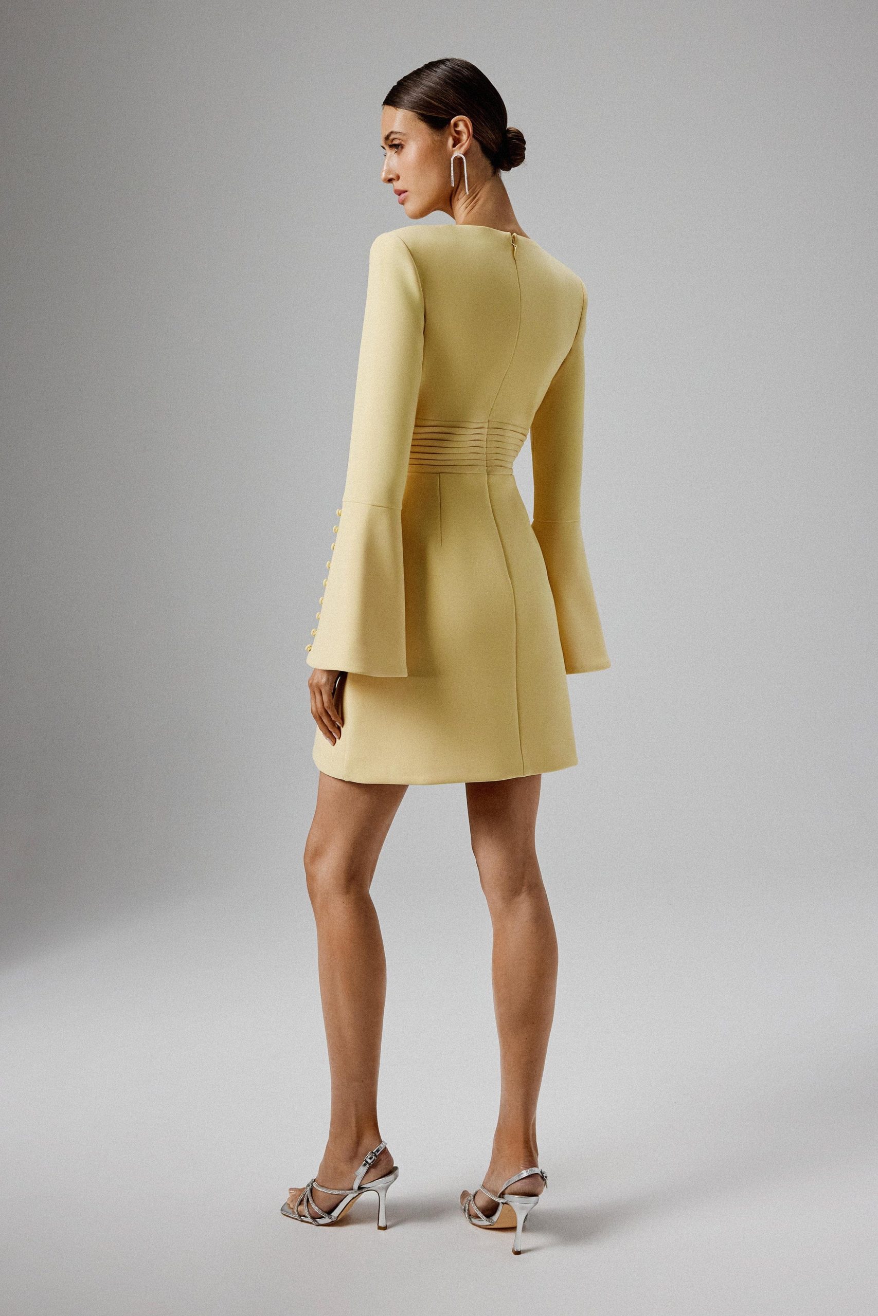 Brighten up your Spring and Summer wardrobe with LARA Fluted Sleeve Micro Shell Button Mini Dress, reimagined in a stunning seasonal yellow hue.Crafted from luxurious premium crepe,this chic mini dress features a flattering pleated waistband that defines your silhouette, flowing into an elegant tulip skirt for a timelessly feminine touch.Long flared sleeves add a refined edge, while delicate gold shell buttons along the center front and sleeve cuffs bring a touch of glamour.Perfect for spring weddings, days at the races, holiday dressing, or any formal occasion, this best-selling style is a must-have for making an effortlessly elegant statement.