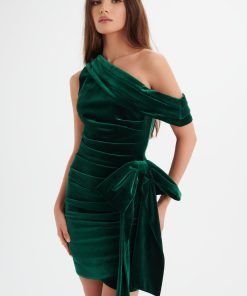 Indulge in luxury with our LEYA Off Shoulder Velvet Mini Dress in Emerald Green. Made from premium velvet, this dress boasts a supersoft and luxurious fabric, while the classic mini length and flattering pleating create a close to body fit. The asymmetric neckline and statement bow detailing add a touch of elegance, making it the perfect choice for any seasonal event. From parties to fancy dinners, this dress is a must-have for your wardrobe.