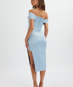 This Bardot Bandeau Pleated Midi Dress features a structured bonded satin fabrication in a refined shade of cornflower blue. The dress showcases notable pleats, fine micro button accents, and a sophisticated longline midi length. The dress boasts a flattering twisted detail neckline for added elegance. Its asymmetric hemline and high split adds glamour, making it the perfect choice for any special occasion. Concealed corsetry and boning ensure a form fitting silhouette.
