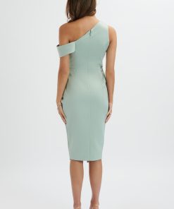 Expertly crafted to exude sophistication, the MAJA is a classic silhouette. With flattering pleating that accentuates the wrap body and elegant wrap skirt, this dress features a structured bonded satin fabric in a subtle shade of sage green. Its asymmetric one shoulder neckline adds a touch of modern elegance to this timeless midi length dress.
