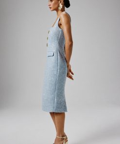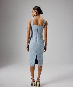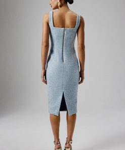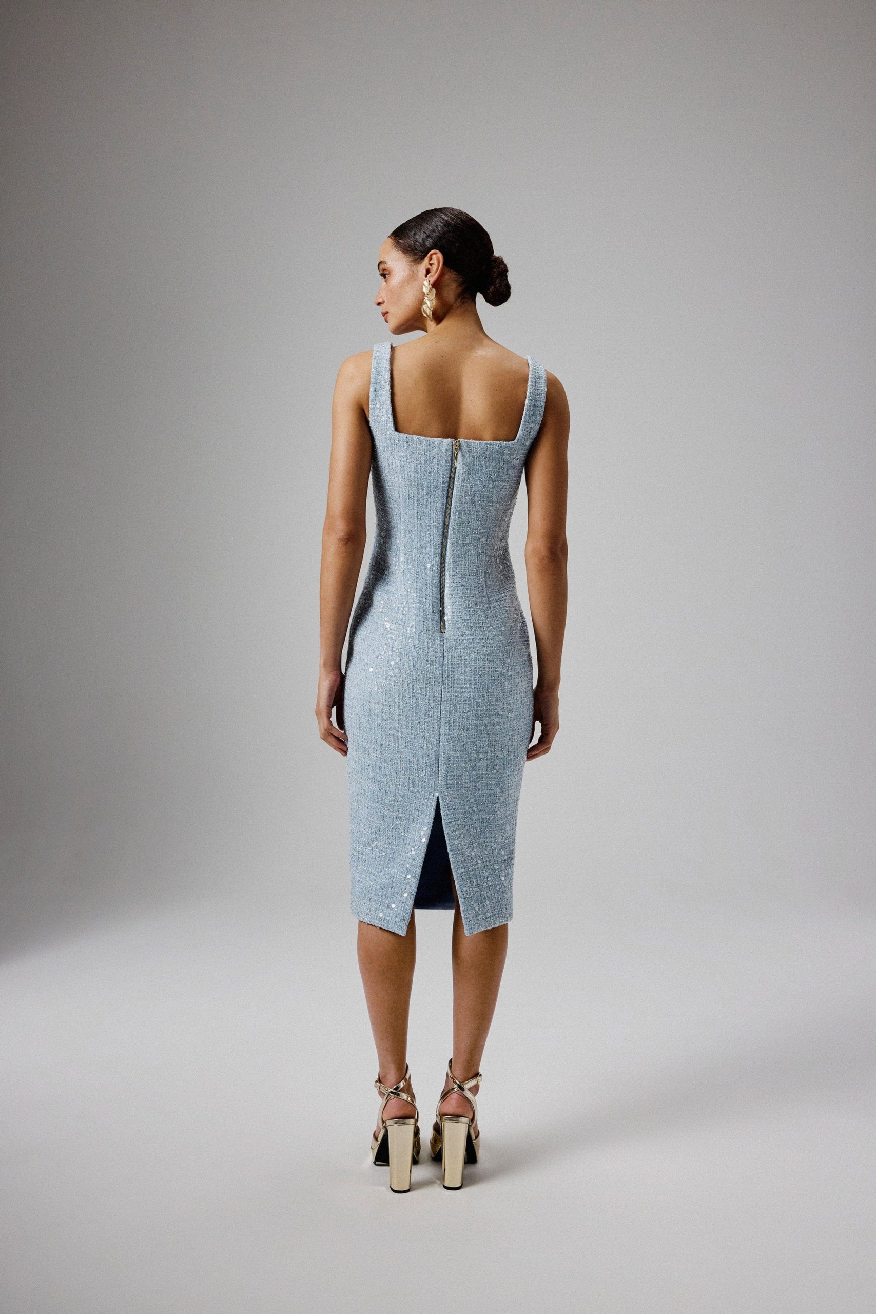 Lavish Alice Women’s Marie Square Neck Boucle Midi Dress With Shell Embellishment In Blue