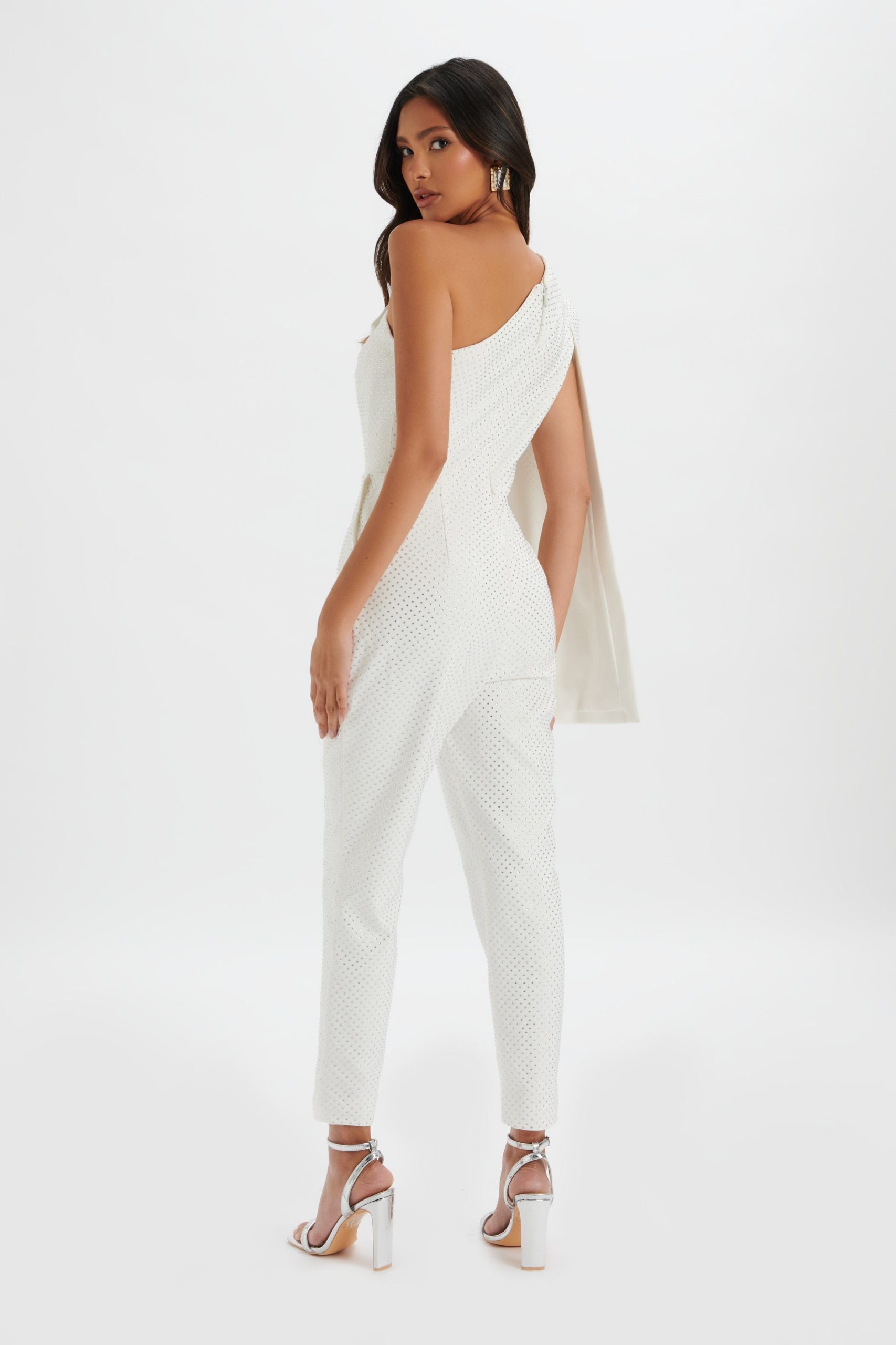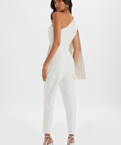 Indulge in luxury with the MISCHA Crystal Embellished One Shoulder Cape Jumpsuit. Made from premium crepe fabric in a crisp white hue, this chic and classy jumpsuit features a stunning one shoulder design and a tapered leg for a sleek silhouette. The crystal hotfix embellishments add a touch of sparkle, perfect for any party or special occasion. Elevate your wardrobe with this dazzling piece.