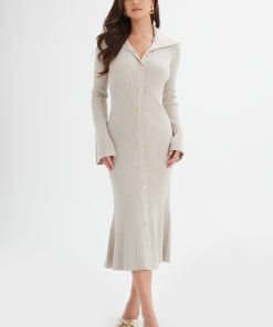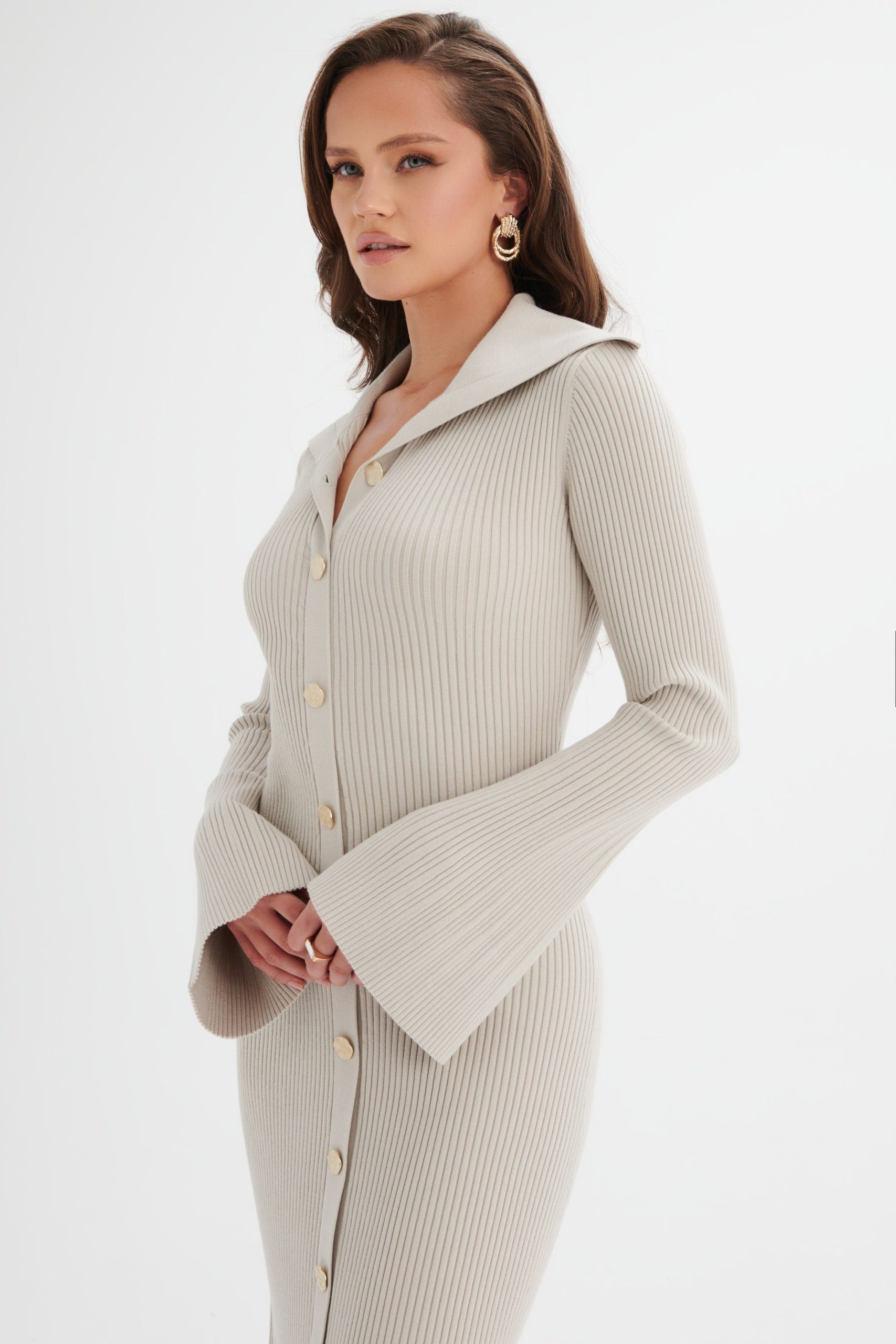 Expertly crafted with a luxurious wool blend and intricate knitted construction, the PARKER dress is a stylish and fitted piece. The ribbed fabric adds texture and the hammered gold buttons add a touch of sophistication. With a flattering fit and flare silhouette, fluted sleeves and collared neckline, this dress is perfect for any occasion.
