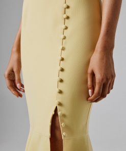 Make a bold style statement with our SAFFRON High Neck Micro Button Midi Dress, now reimagined in a stunning seasonal yellow. Expertly crafted from luxurious premium crepe, this elegant design features a figure-hugging fit that exudes sophistication. The high neckline, adorned with delicate pleat detailing, lends a refined charm, while the flowing midi skirt is elevated by a chic thigh-high split and a flounced hem for an effortlessly flattering silhouette.Intricate micro button accents provide the perfect finishing touch, making this dress an ideal choice for Ladies’ Day, spring weddings, and all your formal occasions this coming season.