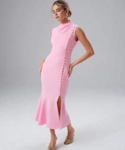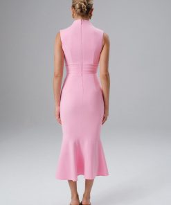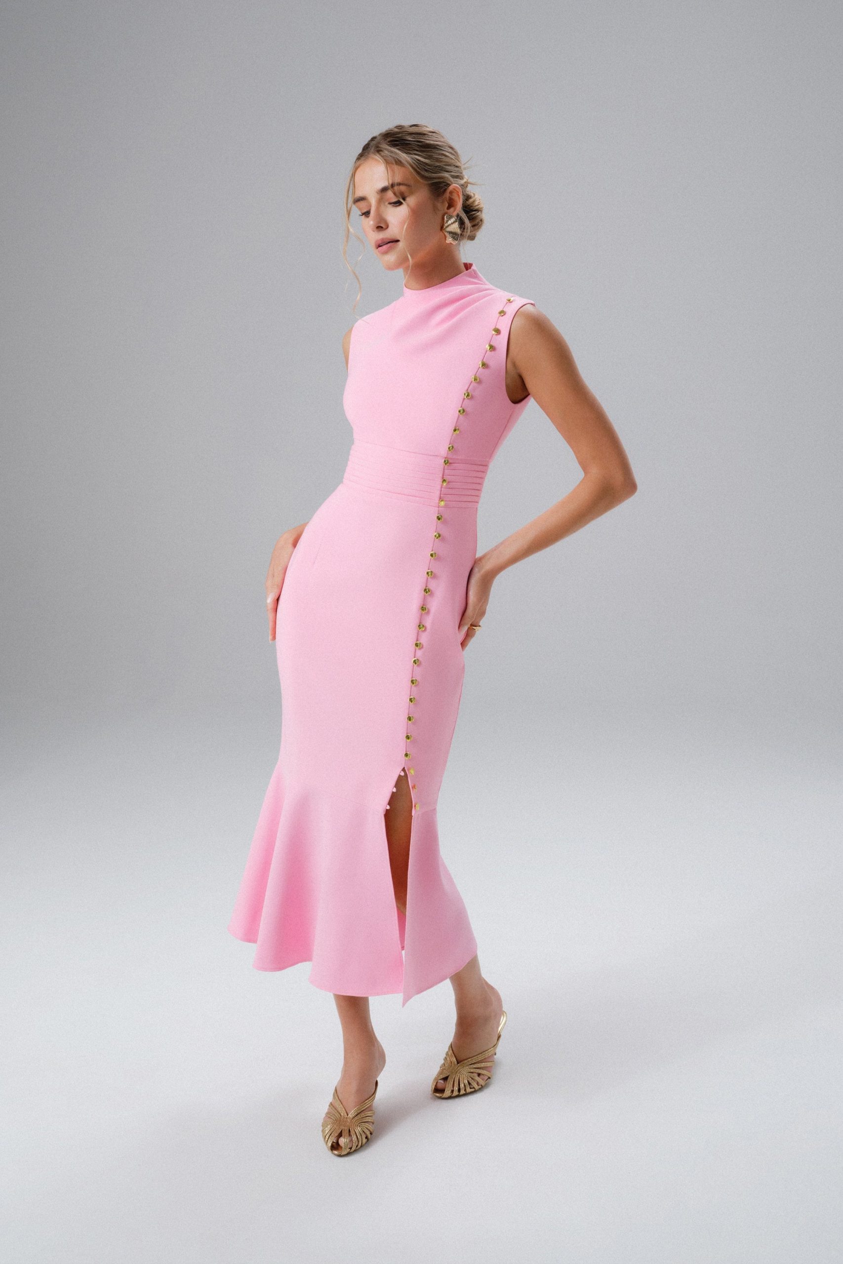 Exuding elegance and sophistication, our SAFFRON Midi Dress is the epitome of refined glamour, perfect for race season, ladies’ day, and wedding guest attire. Crafted from luxurious pink crepe, this best selling design features a high neckline with delicate pleat detailing, flowing elegantly into a midi length with a thigh high split. A flounced hem creates graceful movement with every step, while gold micro shell buttons subtly adorn the design for a refined finish.