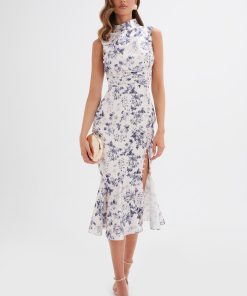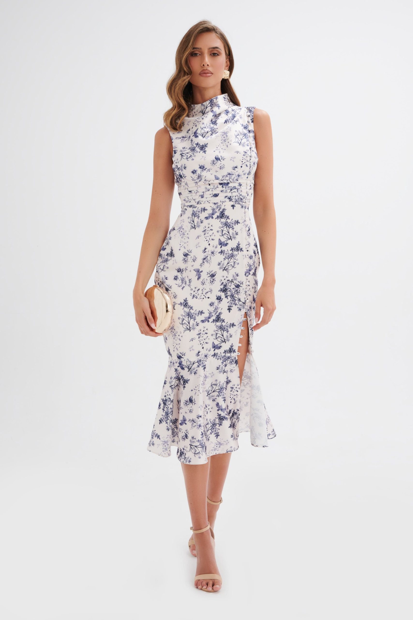 Introducing our best-selling SAFFRON High Neck Satin Midi Dress, now in a captivating navy porcelain print. Crafted from luxurious satin, this elegant dress features a chic high neck and delicate micro button detailing, adding a touch sophistication. With its flattering close-to-body fit, neckline pleats, alluring thigh split, and fit and flare design, it’s perfect for formal events and special occasions. Elevate your wardrobe effortlessly with this timeless piece.
