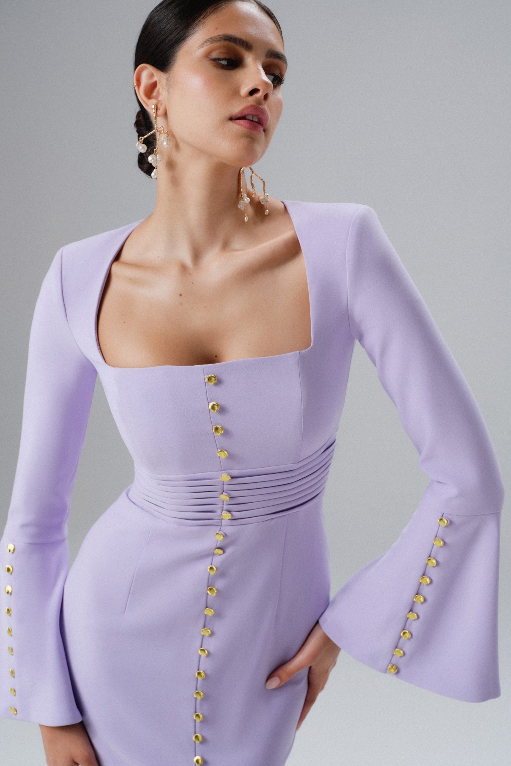 Lavish Alice Women’s Serena Fluted Sleeve Micro Shell Button Midi Dress In Purple