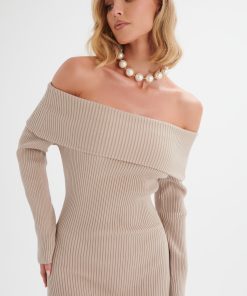 Lavish Alice Women’s Sunday Knitted Rib Bardot Midi Dress In Beige