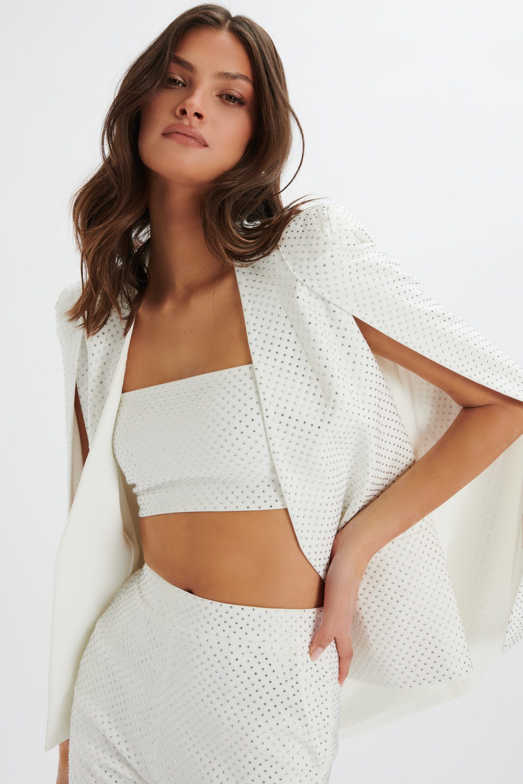 Elevate your wardrobe with the TIA Crystal Embellished Classic Cape Blazer in White, a sparkling reinterpretation of our best-selling cape blazer. Crafted from premium crepe in pristine white, this timeless piece features exquisite crystal embellishments that add a touch of sparkle to its classic design. The collarless neckline and structured silhouette exude sophistication, while the classic cape blazer jacket style offers timeless tailoring. Designed to be worn open, it effortlessly drapes over any outfit, adding an elegant layer of refinement. Pair it with our DINA Crystal Embellished Bandeau in White and ELLISA Crystal Embellished Fit and Flare Trouser in White for a coordinated and stylish ensemble that radiates effortless glamour.