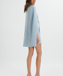 Introducing our timeless and elegant TIFFANY cape blazer dress. Crafted with high quality crepe in a beautiful pastel blue, this mini dress features a flattering belt detail for waist cinching. With shoulder pads, princess seams, and bust darts for shaping, this dress also has a double breasted button fastening for secure coverage. Elevate your style with this classic and structured silhouette.