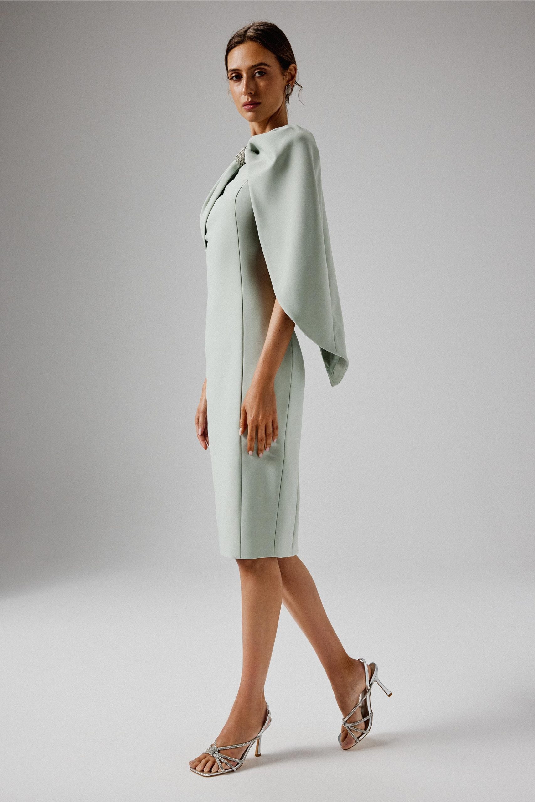 Effortlessly chic, our Tina One Shoulder Embellished Bow Cape Midi Dress in Sage Green is a must-have for your formal wardrobe. Crafted from premium crepe, this dress showcases a bodycon silhouette that gracefully falls to a classic midi length, featuring an elegant centre back split for added allure. The striking one-shoulder cape design is complemented by a statement bow adorned with exquisite embellishments, infusing a touch of glamour and drama into the look. Perfect for weddings, elegant dinners, and other formal occasions, this dress will give you a premium silhouette and a close to body fit.
